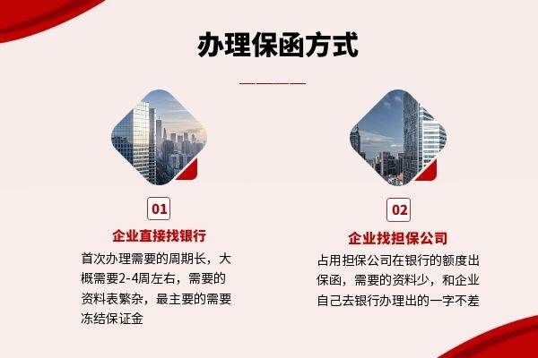 如果企业自己去银行办理,尤其首次办理,得需要半月左右,还得交全额保证金冻结,并且还得给银行手续费,还不如通过占用担保公司在银行出的保函(资料少,速度快(大概付款后1-3个左右的工作日))。